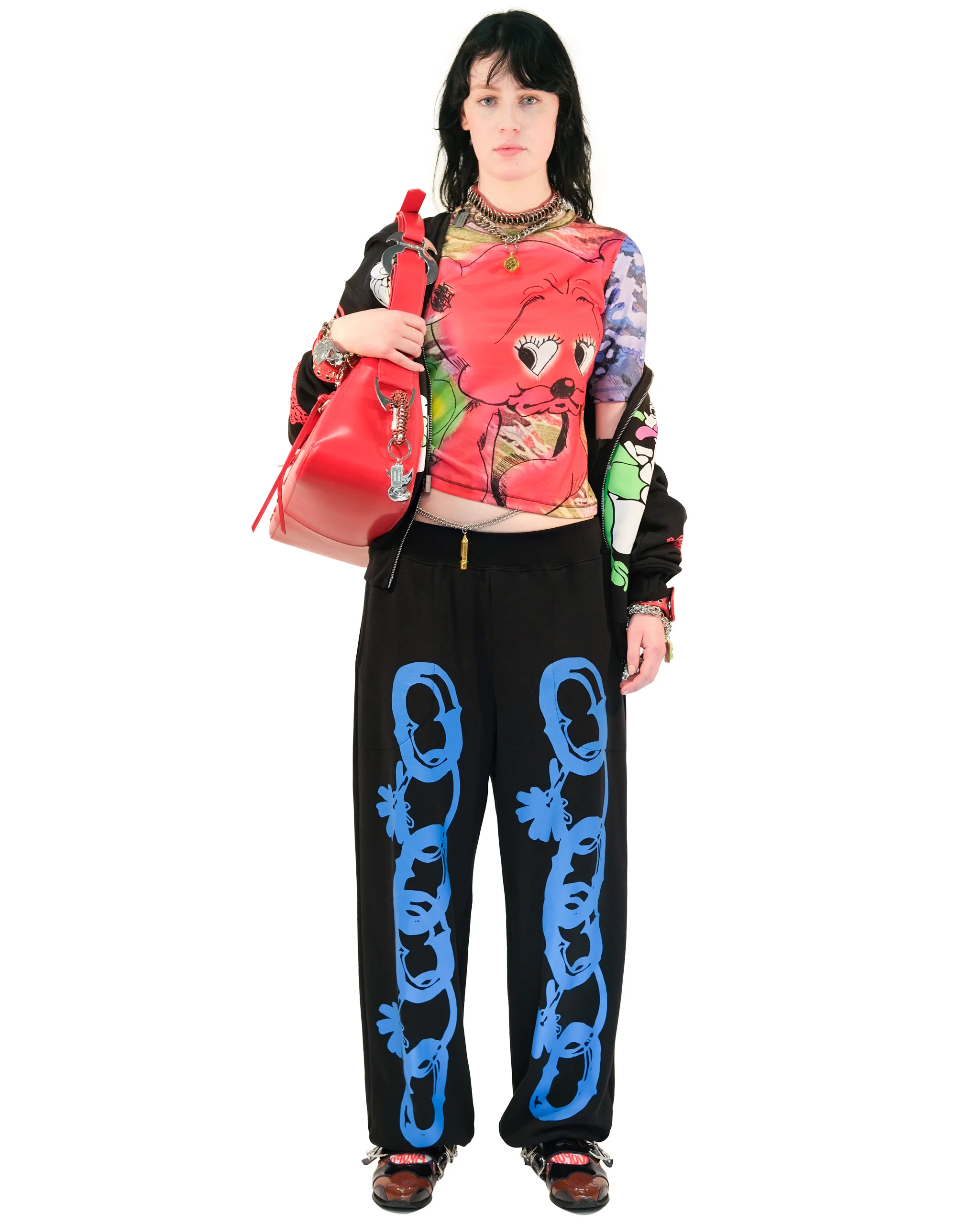 Remember when you used to draw chains of paper dolls, linking hands across the page? The Black Chain Joggers are that childhood dream all grown up. Bright blue links dance down your legs like memories, a remix of nostalgia for the future you always knew you'd become. These are for the nights when you want to feel both soft and unstoppable.